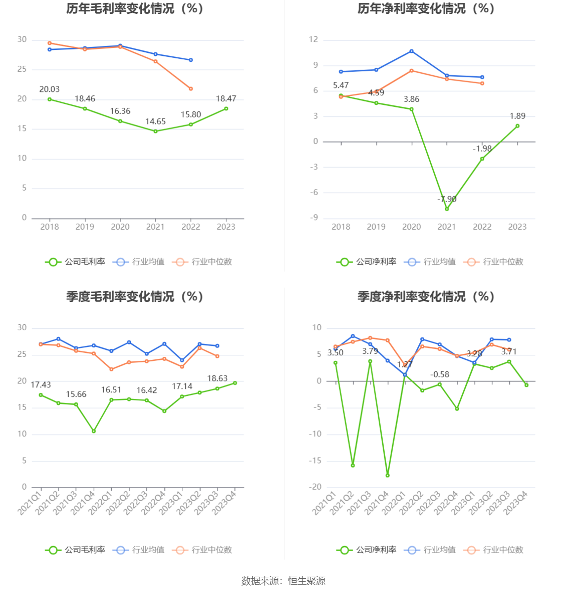 2023年,公司毛利率为18.47%,同比上升2.67个百分点;净利率为1.89%,较上年同期上升3.87个百分点。从单季度指标来看,2023年第四季度公司毛利率为19.68%,同比上升5.28个百分点,环比上升1.05个百分点;净利率为-0.72%,较上年同期上升4.45个百分点,较上一季度下降4.43个百分点。