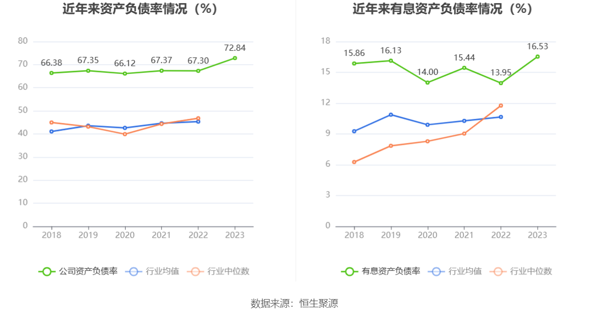 在偿债能力方面,公司2023年年末资产负债率为72.84%,相比上年末上升5.54个百分点;有息资产负债率为16.53%,相比上年末上升2.58个百分点。