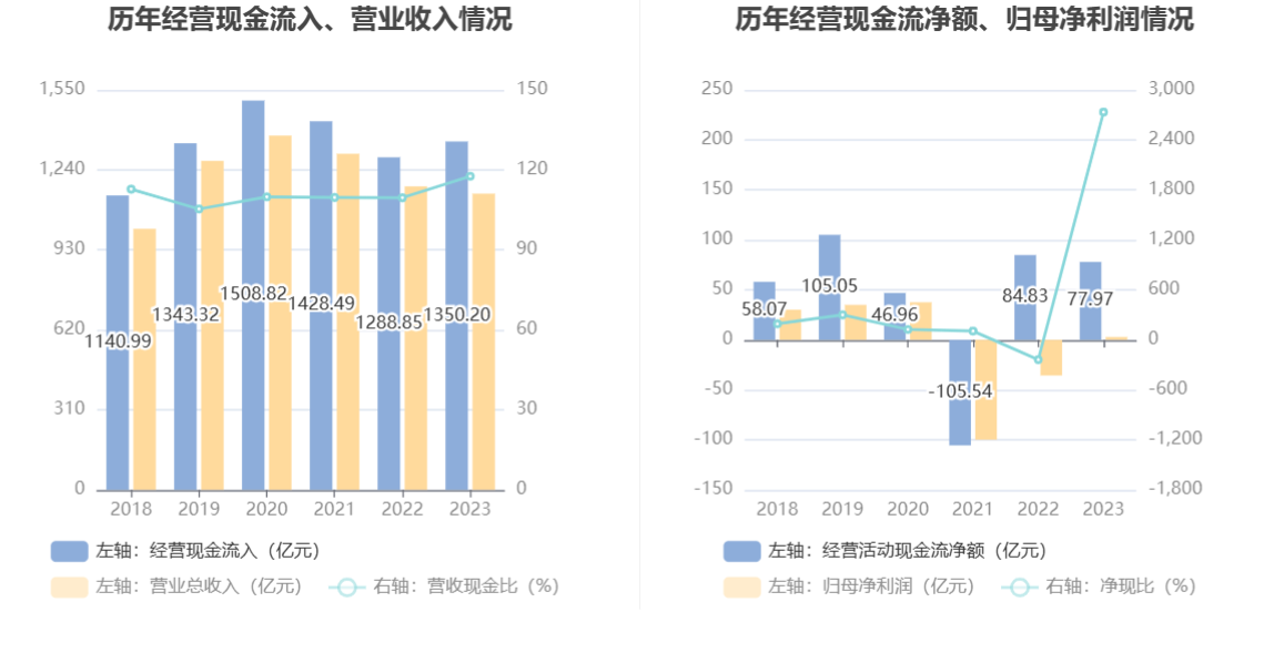 进一步统计发现,2023年公司自由现金流为224.06亿元,相比上年同期增长343.41%。