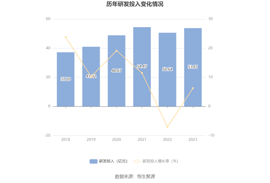 2023年全年,公司研发投入金额为53.81亿元,同比增长6.26%;研发投入占营业收入比例为4.71%,相比上年同期上升0.38个百分点。此外,公司全年研发投入资本化率为0.22%。