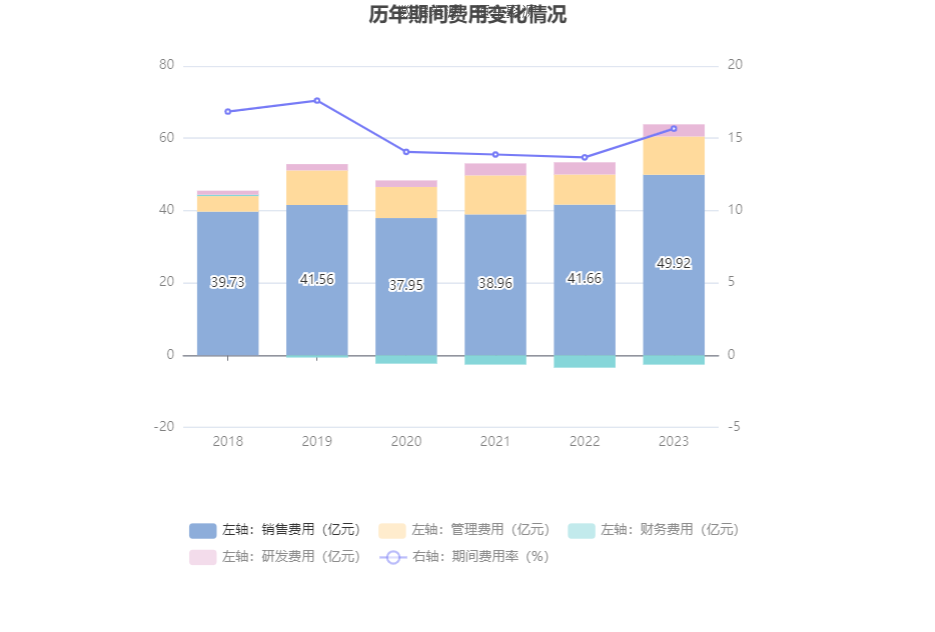 2023年,公司期间费用为61.27亿元,较上年同期增加11.34亿元;期间费用率为15.67%,较上年同期上升1.99个百分点。其中,销售费用同比增长19.84%,管理费用同比增长26.95%,研发费用同比下降0.21%,财务费用由去年同期的-3.43亿元变为-2.59亿元。