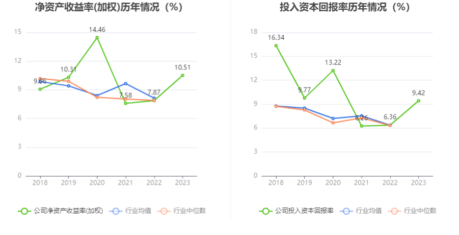 数据显示,2023年公司加权平均净资产收益率为10.51%,较上年同期增长2.64个百分点;公司2023年投入资本回报率为9.42%,较上年同期增长3.06个百分点。