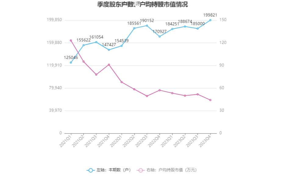 筹码集中度方面,截至2023年年末,公司股东总户数为19.98万户,较三季度末增长了1.48万户,增幅8.01%;户均持股市值由三季度末的51.77万元下降至44.20万元,降幅为14.62%。