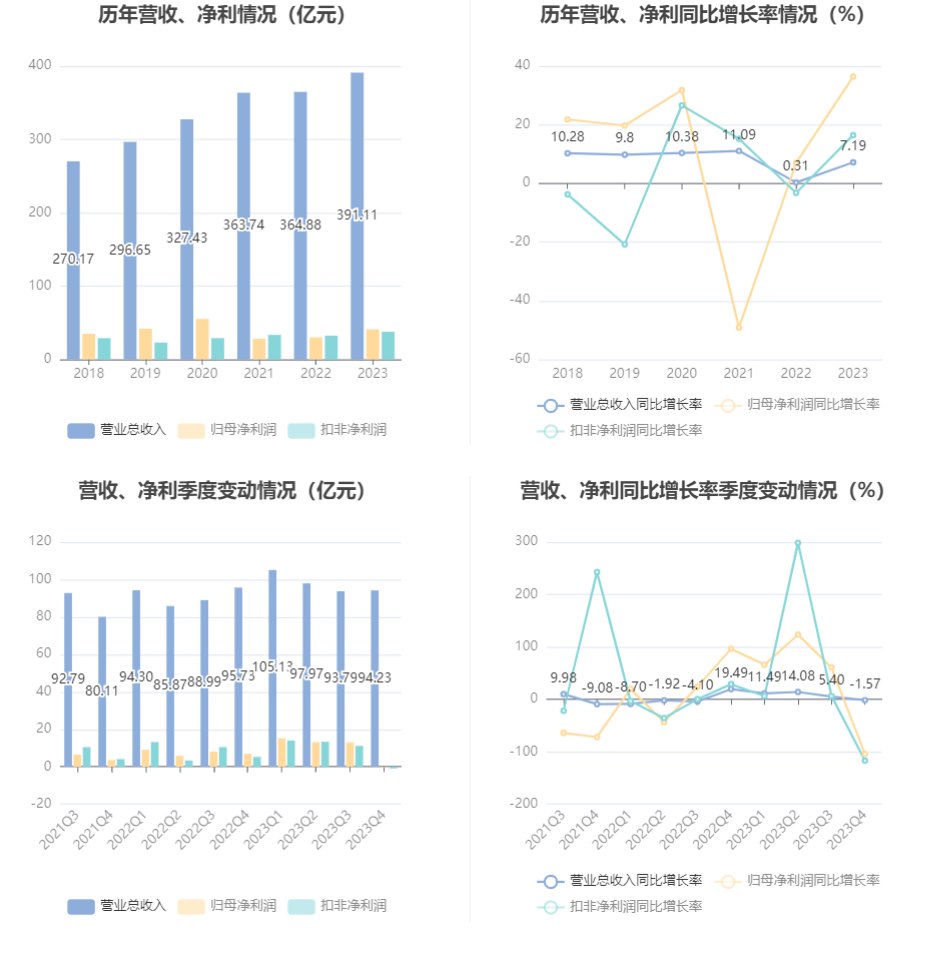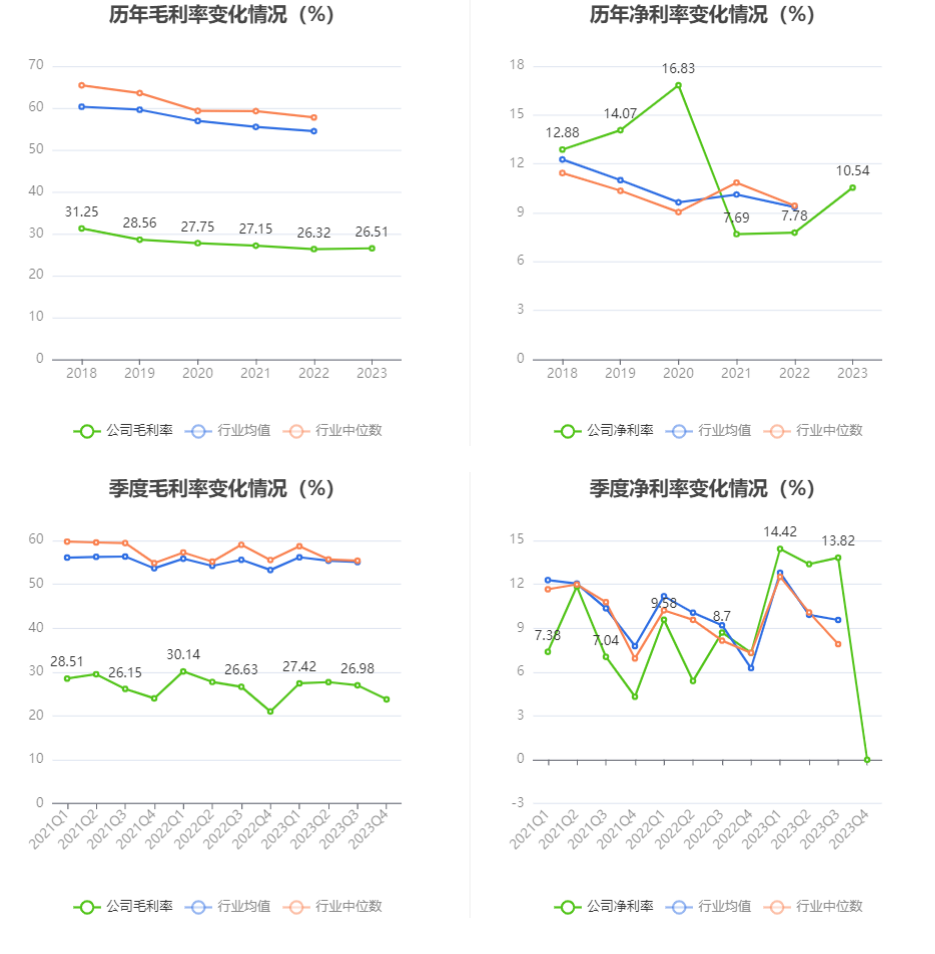 2023年,公司毛利率为26.51%,同比上升0.19个百分点;净利率为10.54%,较上年同期上升2.76个百分点。从单季度指标来看,2023年第四季度公司毛利率为23.77%,同比上升2.76个百分点,环比下降3.21个百分点;净利率为-0.003%,较上年同期下降7.313个百分点,较上一季度下降13.823个百分点。