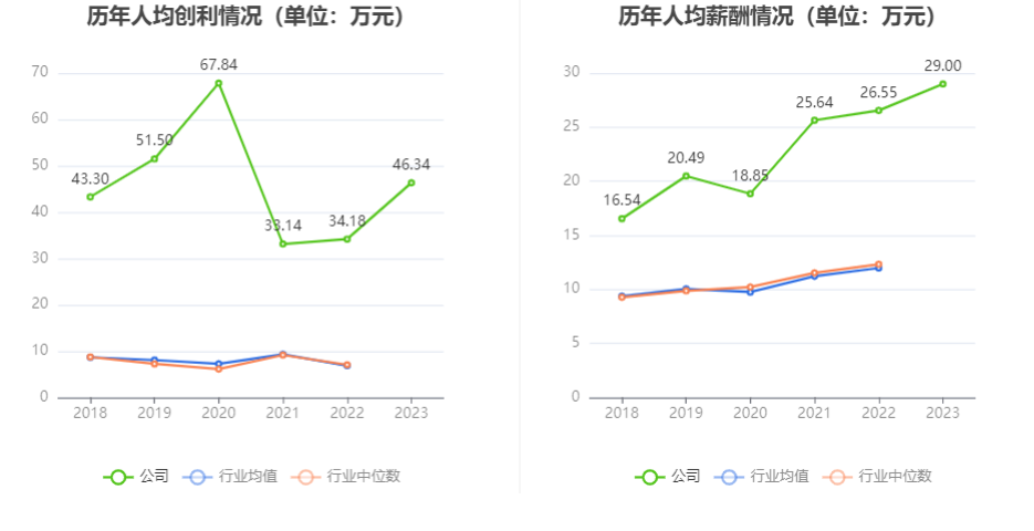 截至2023年末,公司员工总数为8834人,人均创收442.74万元,人均创利46.34万元,人均薪酬29.00万元,较上年同期分别增长6.55%、35.59%、9.23%。