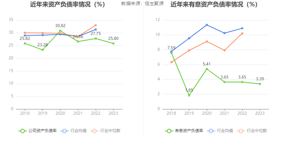 在偿债能力方面,公司2023年年末资产负债率为25.80%,相比上年末下降1.95个百分点;有息资产负债率为3.39%,相比上年末下降0.26个百分点。