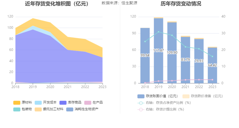 从存货变动来看,截至2023年年末,公司存货账面价值为64.42亿元,占净资产的16.15%,较上年末减少15.51亿元。其中,存货跌价准备为1.41亿元,计提比例为2.15%。