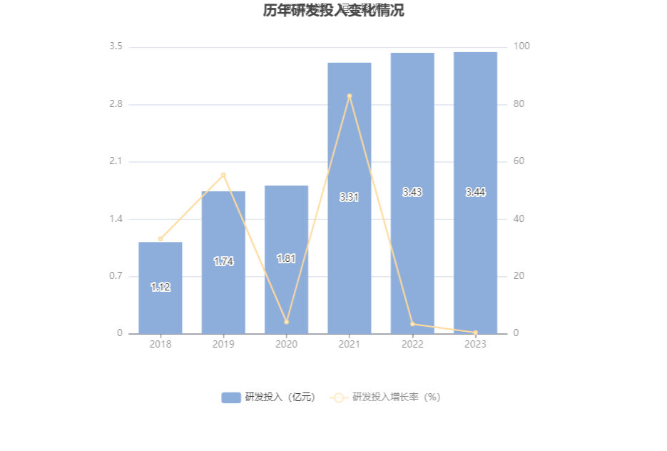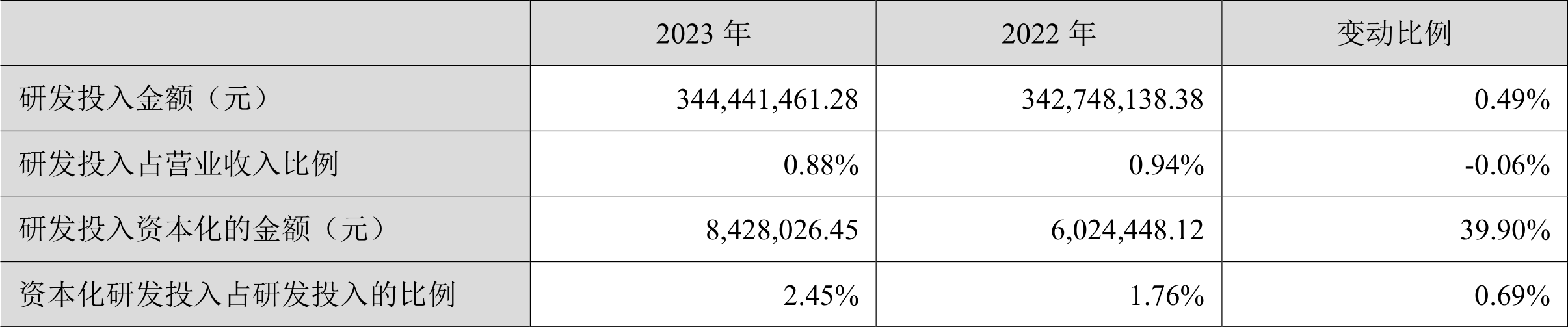 2023年全年,公司研发投入金额为3.44亿元,同比增长0.49%;研发投入占营业收入比例为0.88%,相比上年同期下降0.06个百分点。此外,公司全年研发投入资本化率为2.45%。