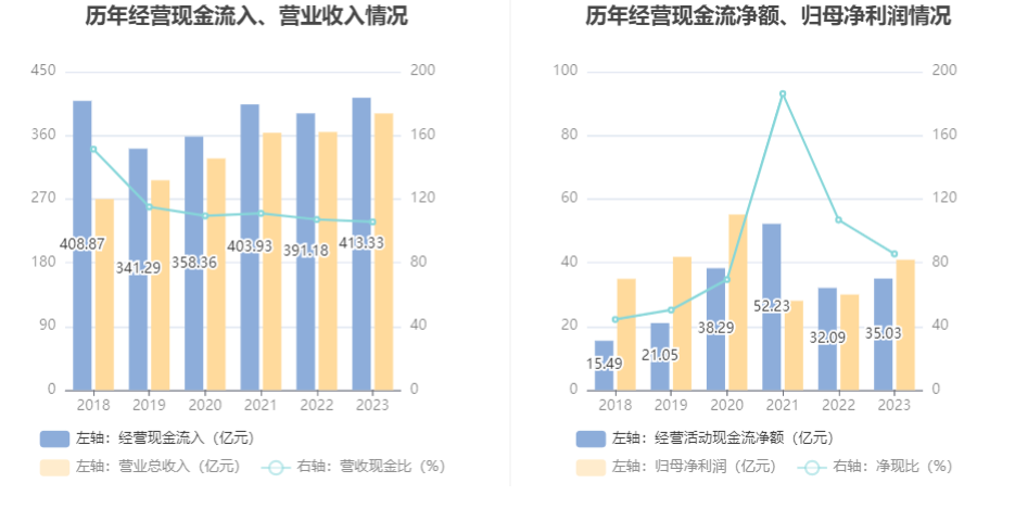 2023年,公司经营活动现金流净额为35.03亿元,同比增长9.14%;筹资活动现金流净额-29.18亿元,同比减少1.85亿元;投资活动现金流净额5.19亿元,上年同期为-63.16亿元。