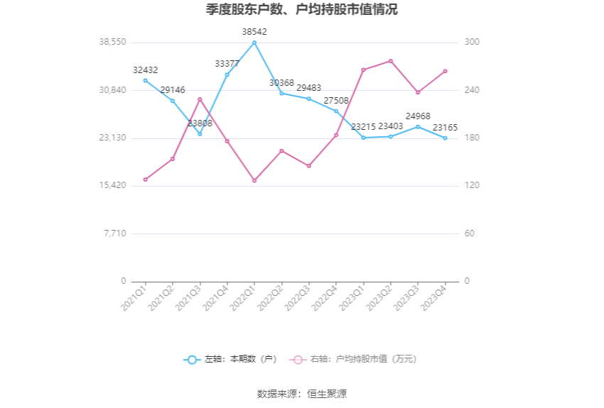 筹码集中度方面,截至2023年年末,公司股东总户数为2.32万户,较三季度末下降了1803户,降幅7.22%;户均持股市值由三季度末的237.45万元上升至264.14万元,增幅为11.24%。