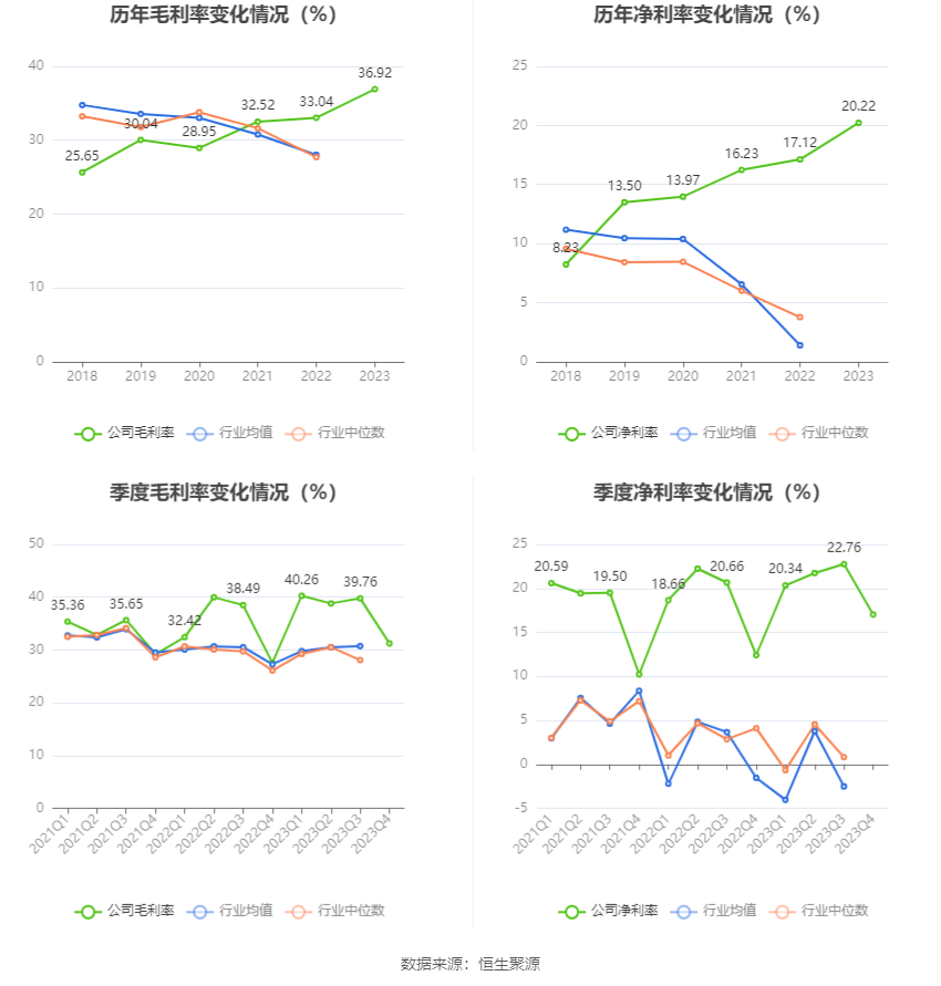 2023年,公司毛利率为36.92%,同比上升3.88个百分点;净利率为20.22%,较上年同期上升3.10个百分点。从单季度指标来看,2023年第四季度公司毛利率为31.24%,同比上升3.70个百分点,环比下降8.52个百分点;净利率为17.02%,较上年同期上升4.62个百分点,较上一季度下降5.74个百分点。
