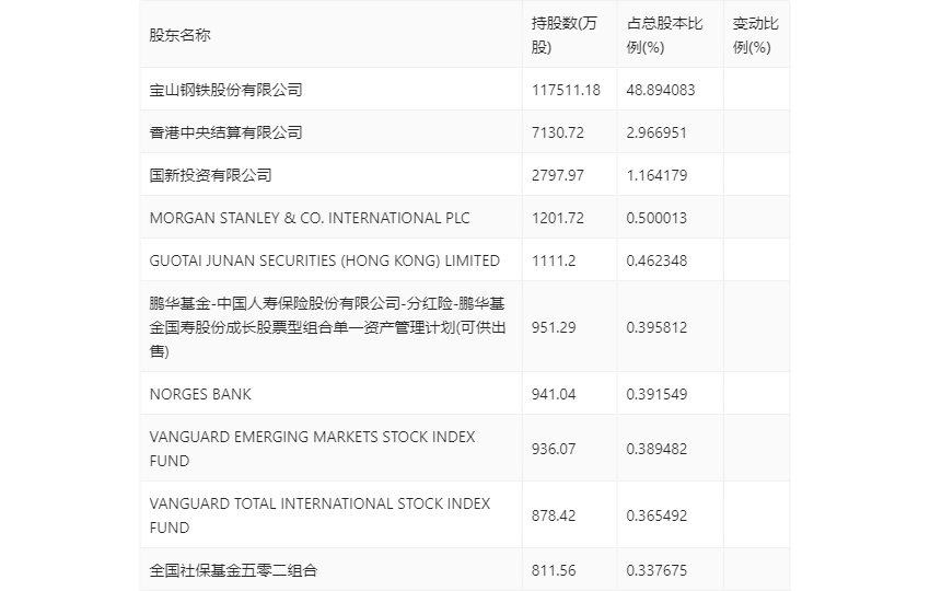 年报显示,2023年年末公司十大流通股东中,新进股东为NORGES BANK、全国社保基金五零二组合,取代了三季度末的金樟贤、ISHARES MSCI EMERGING MARKETS MIN VOL FACTOR ETF。在具体持股比例上,国新投资有限公司、MORGAN STANLEY & CO. INTERNATIONAL PLC、GUOTAI JUNAN SECURITIES (HONG KONG) LIMITED持股有所上升,宝山钢铁股份有限公司、香港中央结算有限公司、鹏华基金-中国人寿保险股份有限公司-分红险-鹏华基金国寿股份成长股票型组合单一资产管理计划(可供出售)、VANGUARD EMERGING MARKETS STOCK INDEX FUND、VANGUARD TOTAL INTERNATIONAL STOCK INDEX FUND持股有所下降。