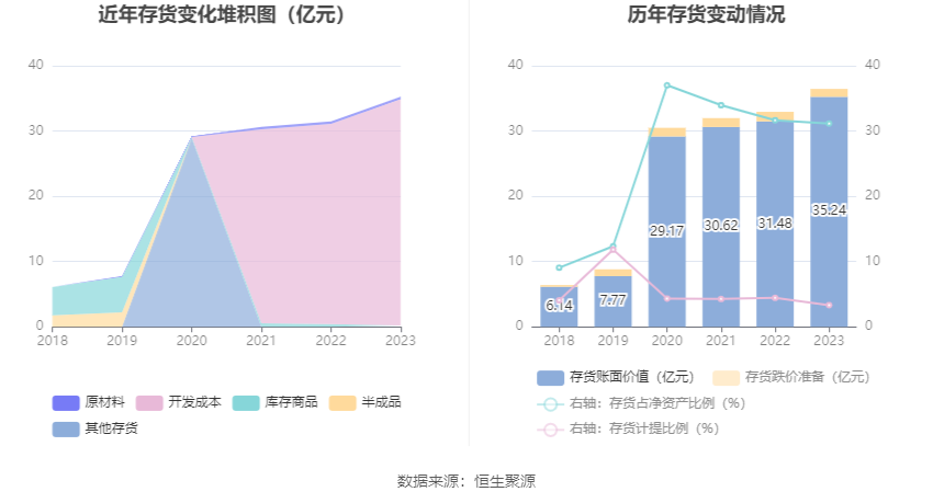 从存货变动来看,截至2023年年末,公司存货账面价值为35.24亿元,占净资产的31.16%,较上年末增加3.76亿元。其中,存货跌价准备为1.21亿元,计提比例为3.33%。