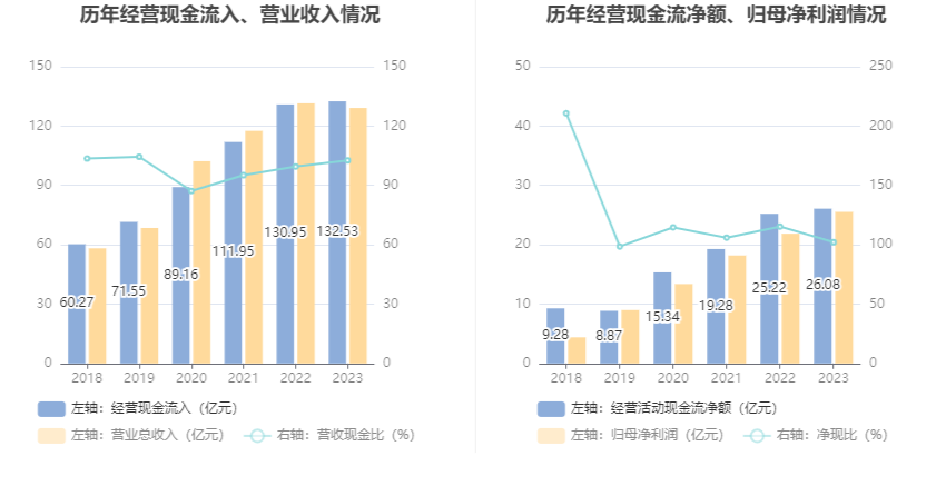 2023年,公司经营活动现金流净额为26.08亿元,同比增长3.45%;筹资活动现金流净额-12.17亿元,同比增加3.64亿元;投资活动现金流净额-3.21亿元,上年同期为-2.91亿元。