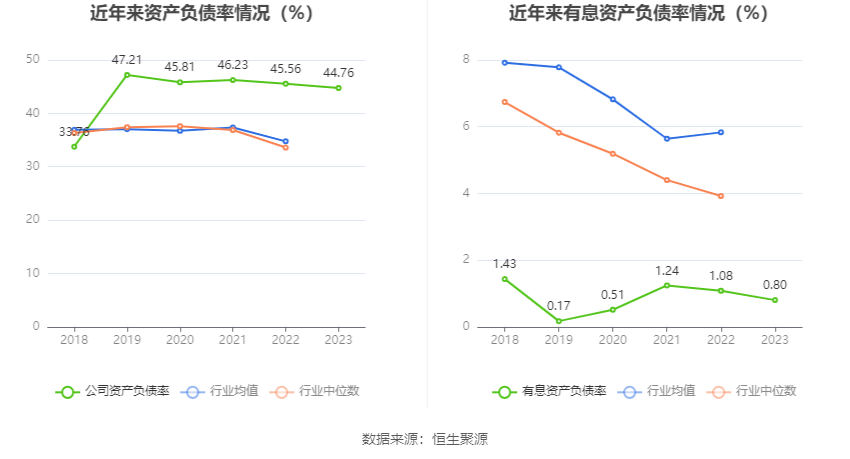 在偿债能力方面,公司2023年年末资产负债率为44.76%,相比上年末下降0.80个百分点;有息资产负债率为0.80%,相比上年末下降0.28个百分点。