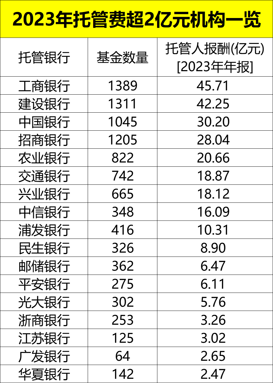 此外,中信银行、浦发银行、民生银行、邮储银行、平安银行、光大银行等托管费收入超5亿元。