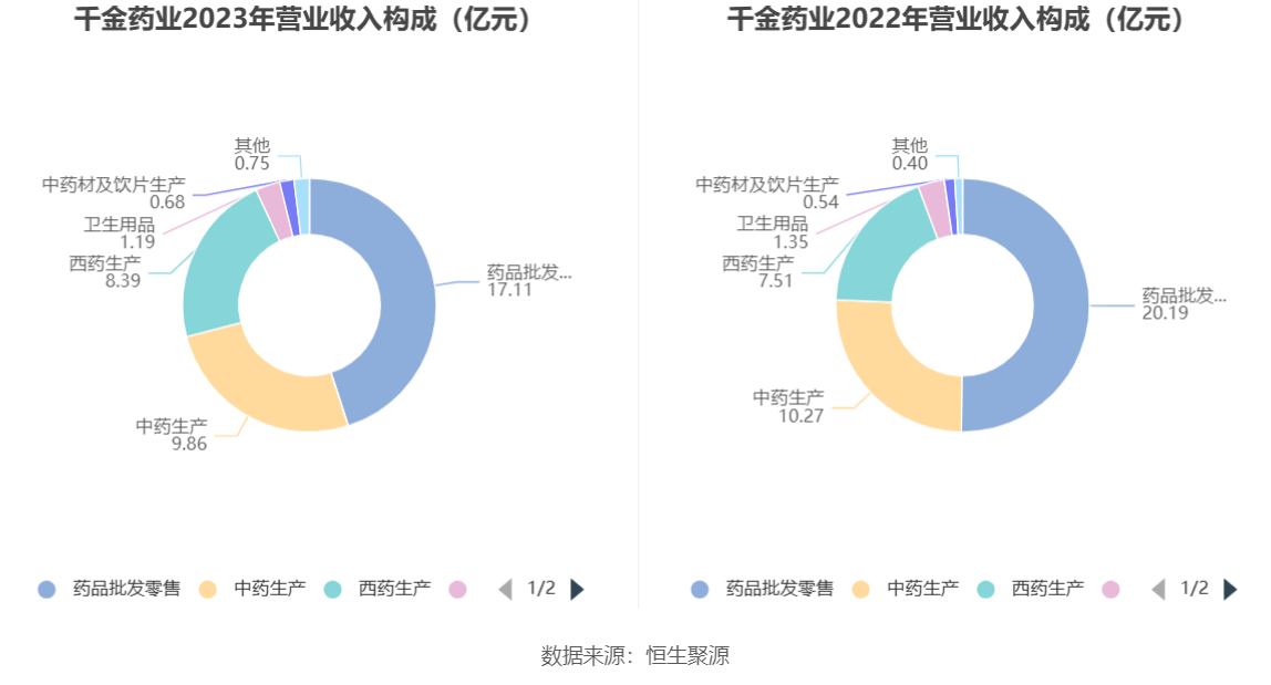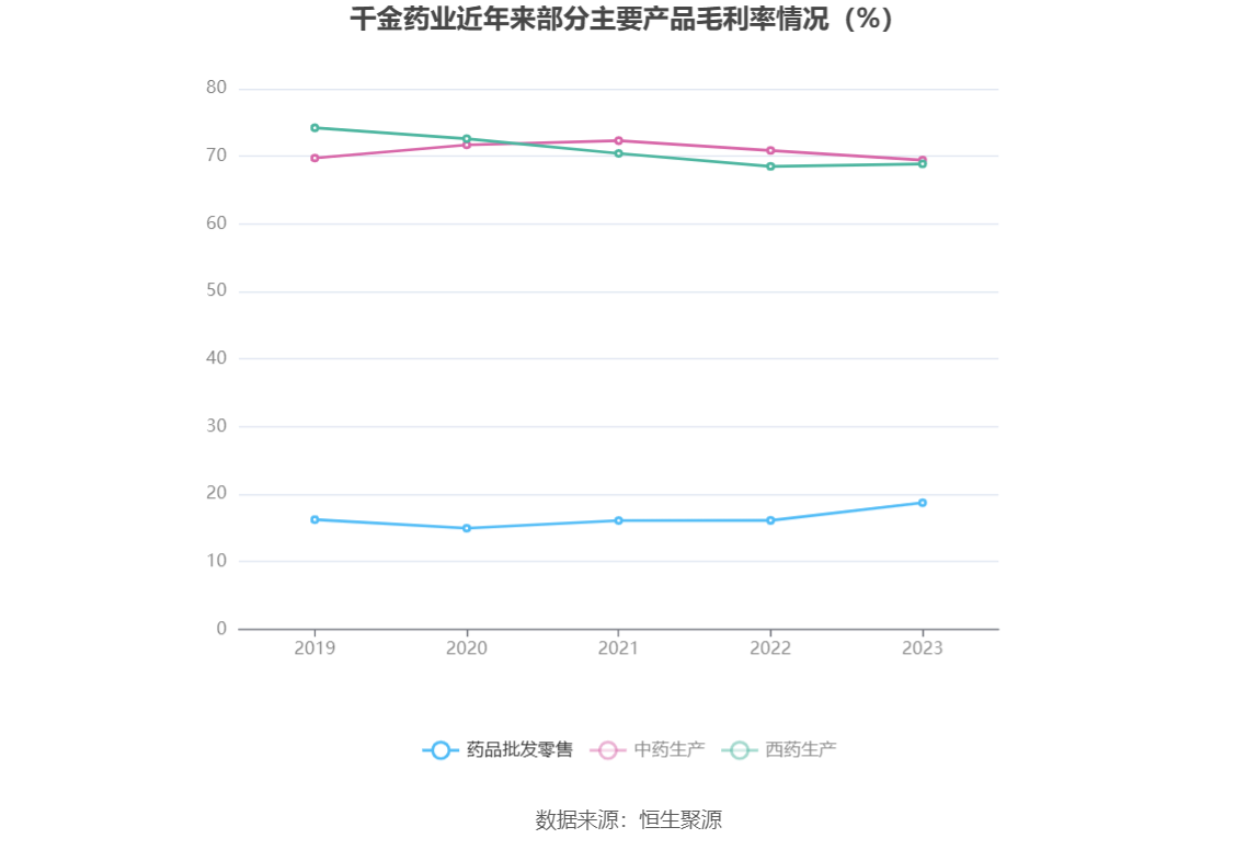 分产品看,药品批发零售、中药生产、西药生产2023年毛利率分别为18.74%、69.45%、68.88%。