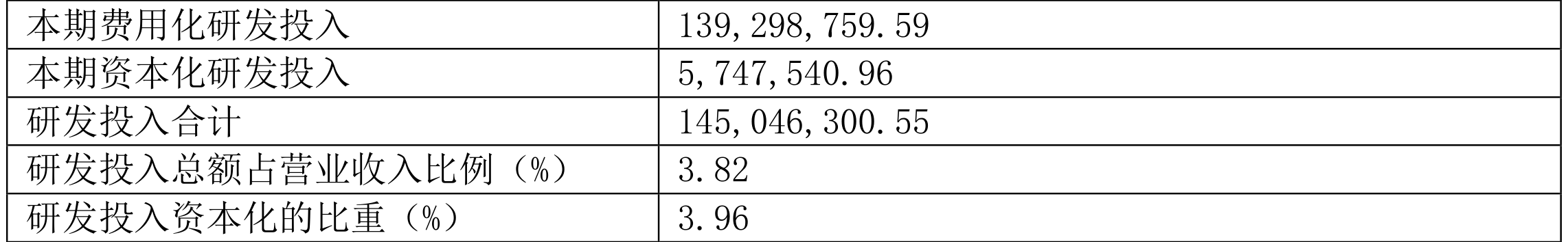 2023年全年,公司研发投入金额为1.45亿元,同比增长27.56%;研发投入占营业收入比例为3.82%,相比上年同期上升1.00个百分点。此外,公司全年研发投入资本化率为3.96%。