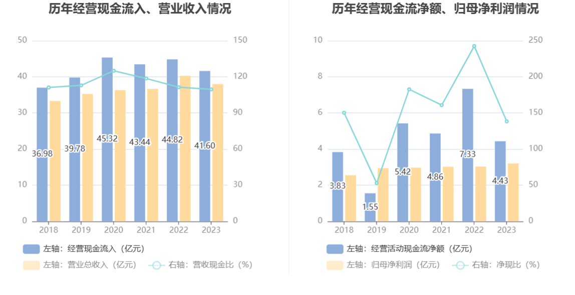 2023年,公司经营活动现金流净额为4.43亿元,同比下降39.59%;筹资活动现金流净额-2.02亿元,同比增加6218.37万元;投资活动现金流净额5.85亿元,上年同期为1.22亿元。