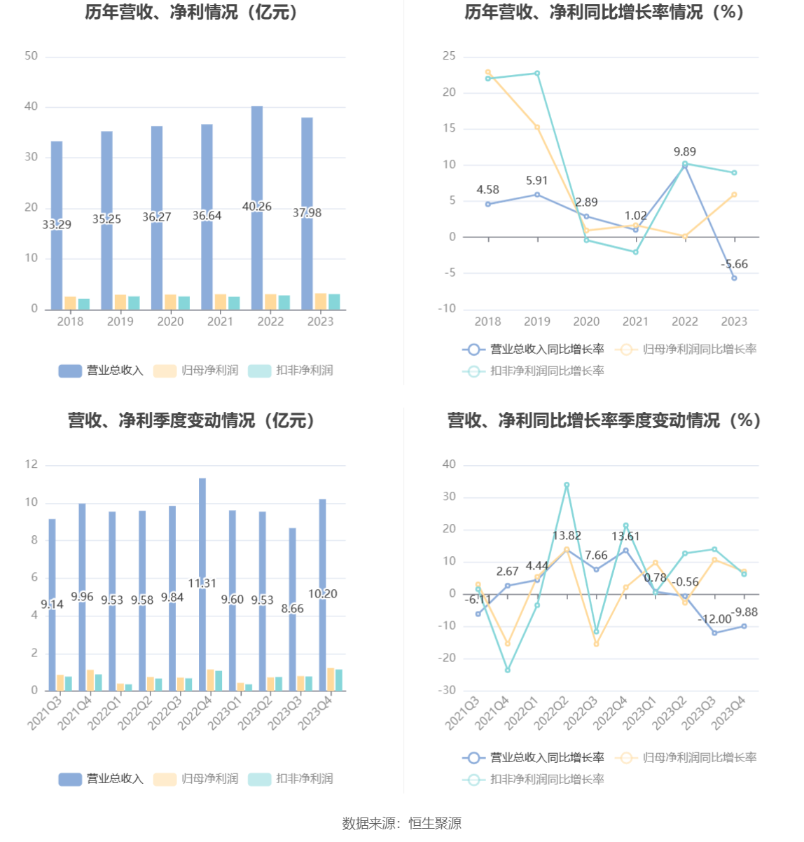 2023年,公司毛利率为46.12%,同比上升2.99个百分点;净利率为10.40%,较上年同期上升0.78个百分点。从单季度指标来看,2023年第四季度公司毛利率为46.19%,同比上升5.16个百分点,环比下降2.25个百分点;净利率为15.24%,较上年同期上升0.83个百分点,较上一季度上升4.24个百分点。