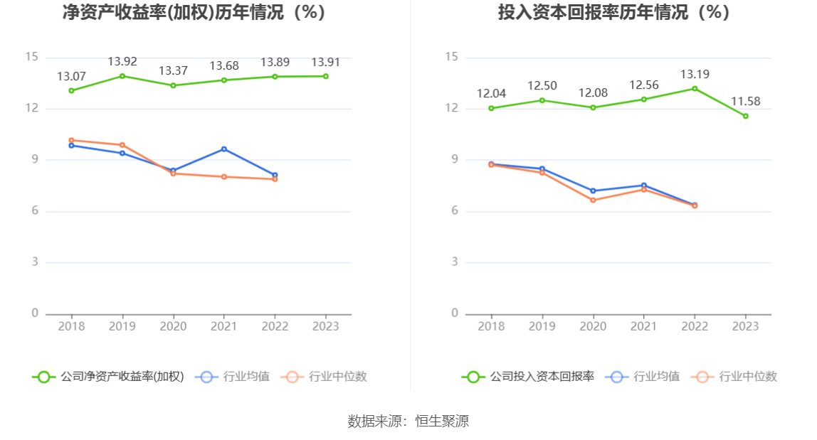 数据显示,2023年公司加权平均净资产收益率为13.91%,较上年同期增长0.02个百分点;公司2023年投入资本回报率为11.58%,较上年同期下降1.61个百分点。