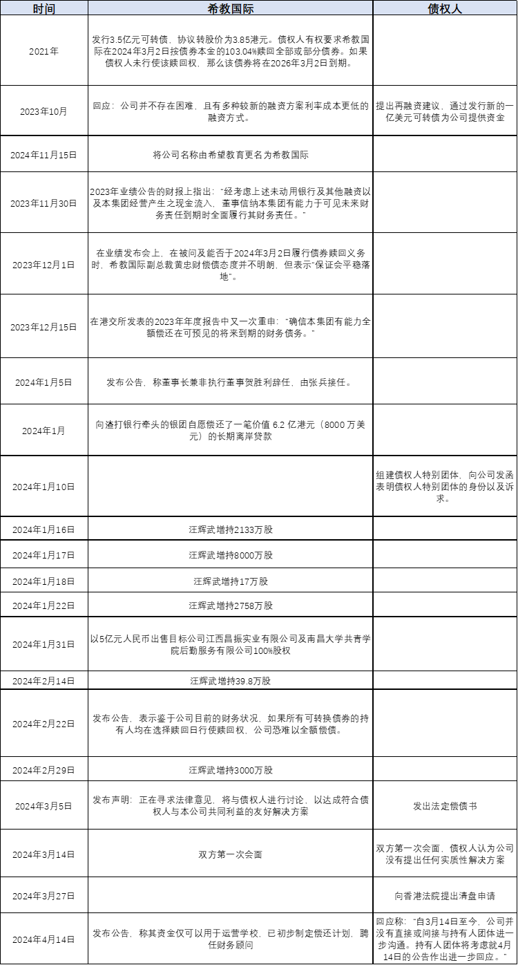 因希教国际未能偿还一笔3.24亿美元的可转债,3月27日,一个持有希教国际所担保离岸可转换债券49.1%权益的债券持有人特别团体,指示可转债受托人纽约梅隆银行伦敦分行向香港法院提交了针对希教国际的清盘申请书。香港法院将在2024年6月19日就清盘呈请举行首次聆讯。