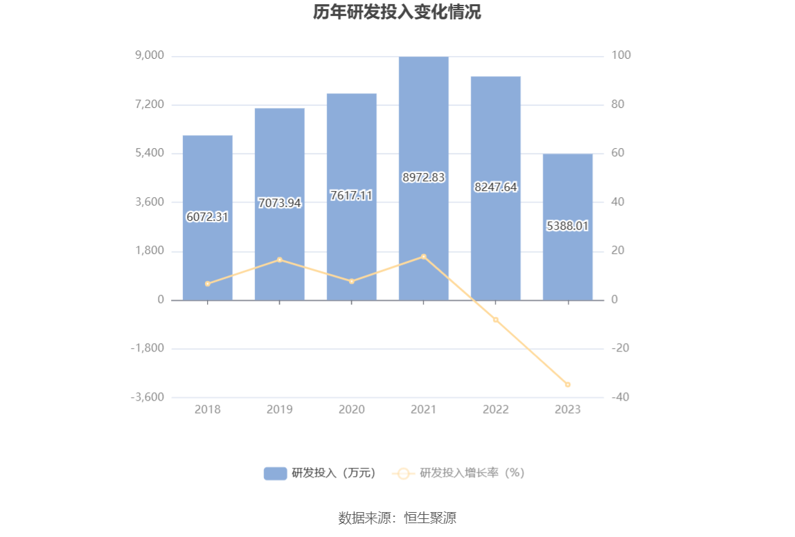 2023年全年,公司研发投入金额为5388.01万元,同比下降34.67%;研发投入占营业收入比例为37.28%,相比上年同期下降20.63个百分点。此外,公司全年研发投入资本化率为0。