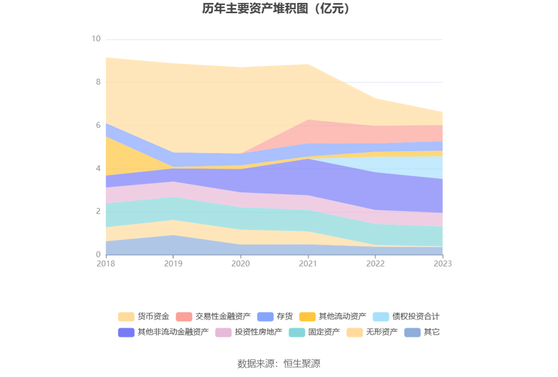 资产重大变化方面,截至2023年年末,公司货币资金较上年末减少52.20%,占公司总资产比重下降8.31个百分点;债权投资合计较上年末增加46.13%,占公司总资产比重上升6.01个百分点;存货较上年末增加11.03%,占公司总资产比重上升1.19个百分点;无形资产较上年末减少81.19%,占公司总资产比重下降0.92个百分点。