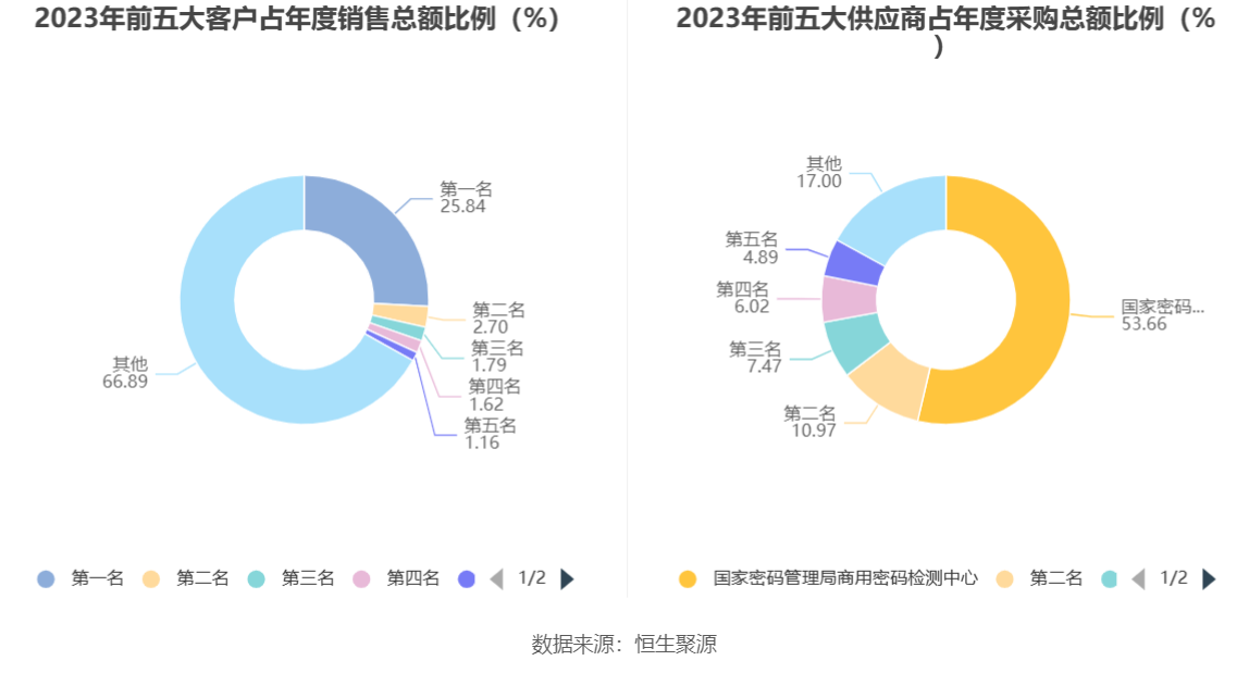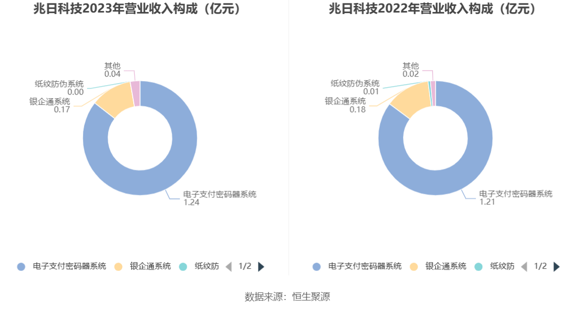 分产品来看,2023年公司主营业务中,电子支付密码器系统收入1.24亿元,同比增长2.71%,占营业收入的86.06%;银企通系统收入0.17亿元,同比下降5.81%,占营业收入的11.83%;纸纹防伪系统收入0.00亿元,同比下降21.49%,占营业收入的0.28%。