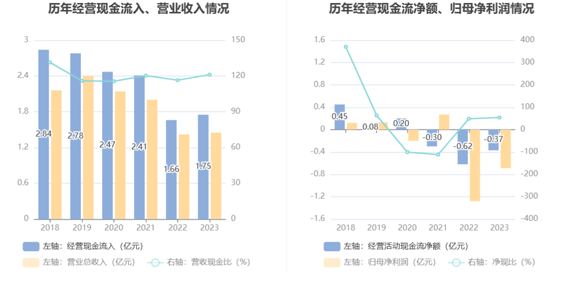 2023年,公司经营活动现金流净额为-3713.02万元,同比增加2477.47万元;筹资活动现金流净额-861.46万元,同比增加205.27万元;投资活动现金流净额-119.70万元,上年同期为6241.3万元。