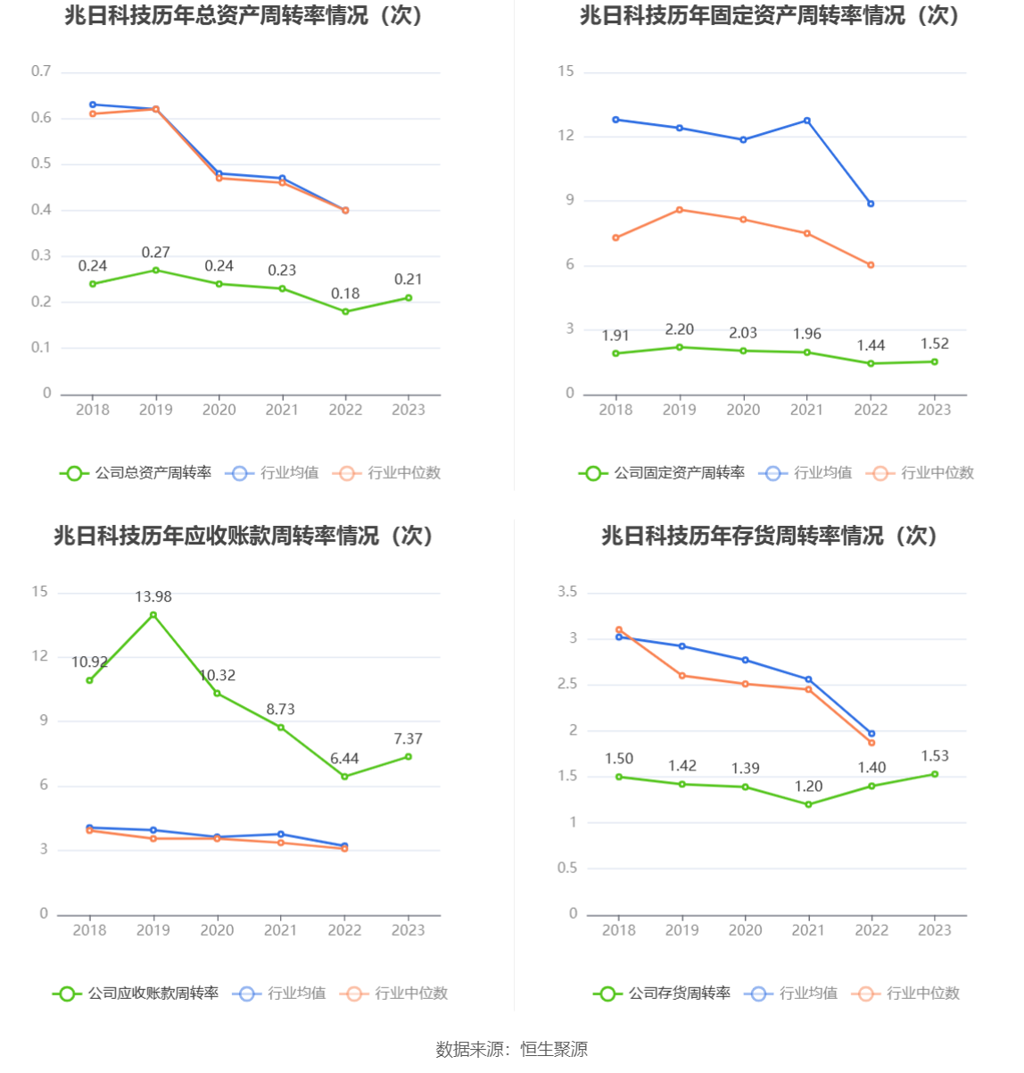 营运能力方面,2023年,公司公司总资产周转率为0.21次,上年同期为0.18次(2022年行业平均值为0.40次,公司位居同行业59/62);固定资产周转率为1.52次,上年同期为1.44次(2022年行业平均值为8.88次,公司位居同行业59/62);公司应收账款周转率、存货周转率分别为7.37次、1.53次。