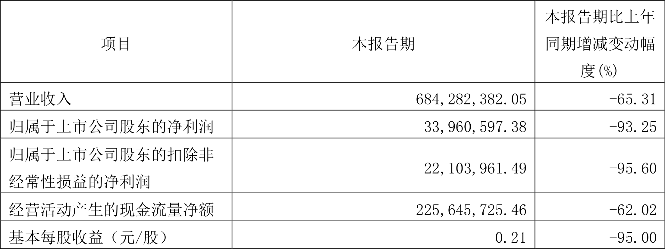 艾罗能源(688717)4月22日披露2024年第一季度报告。公司实现营业收入6.84亿元,同比下降65.31%;归母净利润3396.06万元,同比下降93.25%;扣非净利润2210.4万元同比下降95.60%;经营活动产生的现金流量净额为2.26亿元,同比下降62.02%;报告期内,艾罗能源基本每股收益为0.21元,加权平均净资产收益率为0.78%。