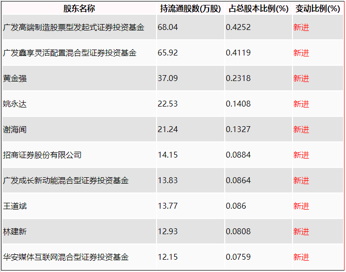 一季报显示,2024年一季度末的公司十大流通股东中,新进股东为广发高端制造股票型发起式证券投资基金、广发鑫享灵活配置混合型证券投资基金、黄金强、姚永达、谢海闻、招商证券股份有限公司、广发成长新动能混合型证券投资基金、王道斌、林建新、华安媒体互联网混合型证券投资基金。