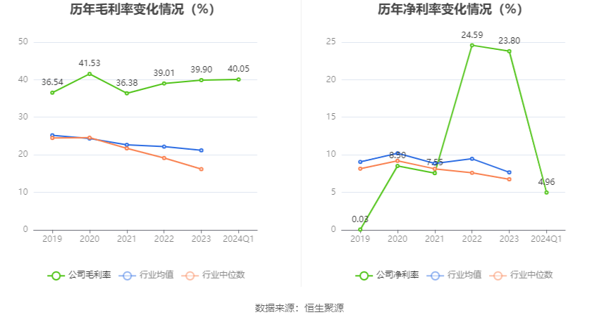 2024年第一季度,公司毛利率为40.05%,同比持平;净利率为4.96%,较上年同期下降20.56个百分点。