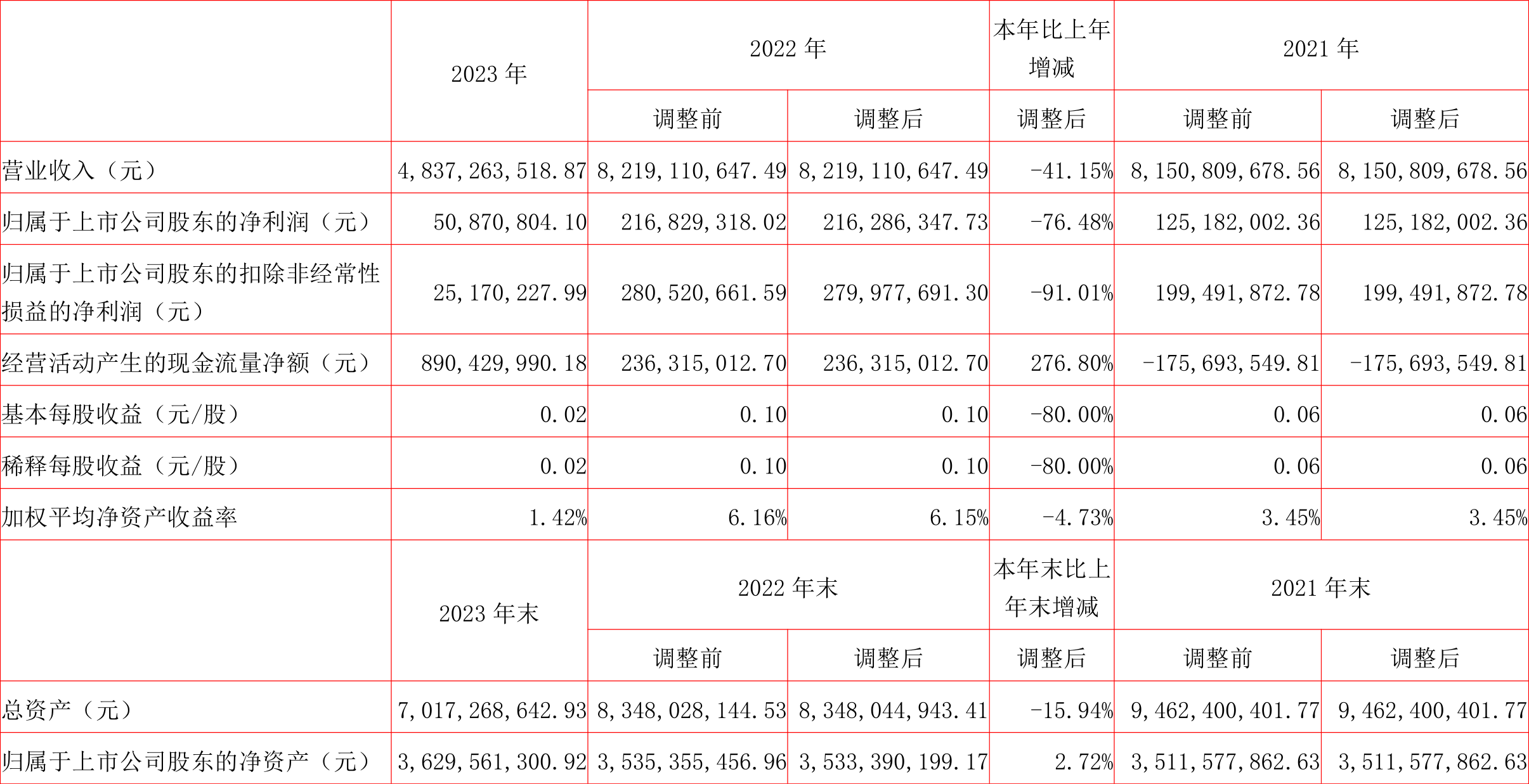 数据显示,2023年公司加权平均净资产收益率为1.42%,较上年同期下降4.74个百分点;公司2023年投入资本回报率为0.62%,较上年同期下降2.39个百分点。