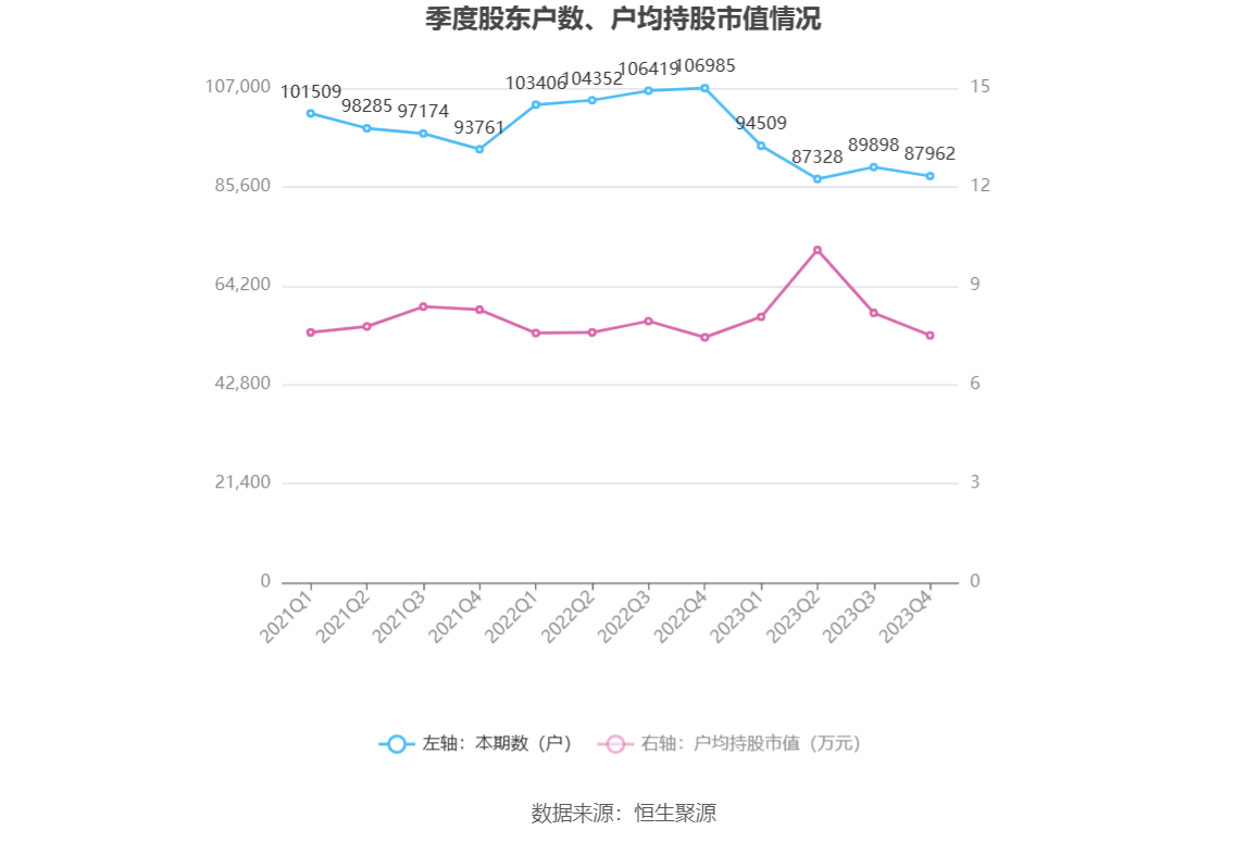 筹码集中度方面,截至2023年年末,公司股东总户数为8.8万户,较三季度末下降了1936户,降幅2.15%;户均持股市值由三季度末的8.18万元下降至7.50万元,降幅为8.31%。