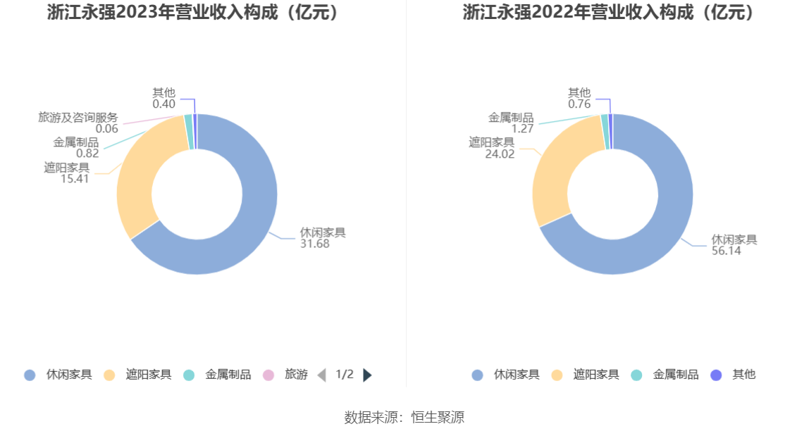 分产品来看,2023年公司主营业务中,休闲家具收入31.68亿元,同比下降43.56%,占营业收入的65.50%;遮阳家具收入15.41亿元,同比下降35.86%,占营业收入的31.85%;金属制品收入0.82亿元,同比下降35.05%,占营业收入的1.70%。