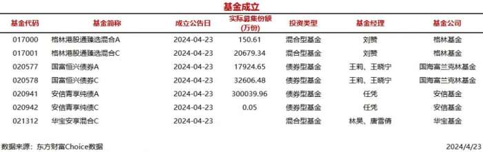 南方财经4月23日电,据东方财富Choice数据统计,今日共有7只基金公告成立(A/C类分开计算),包括4只债券型基金、3只混合型基金。