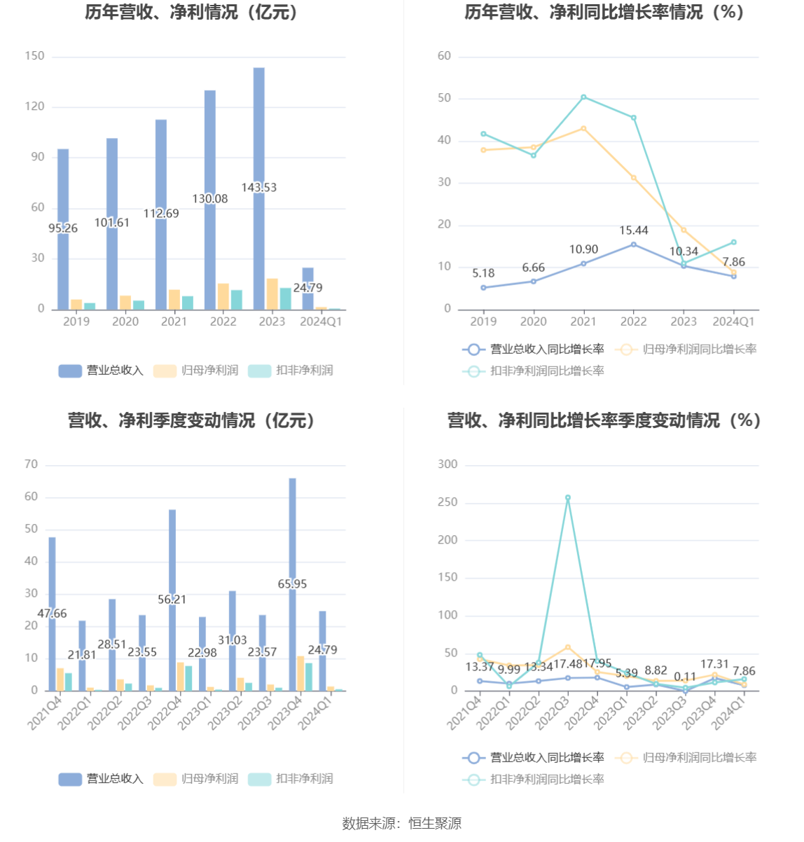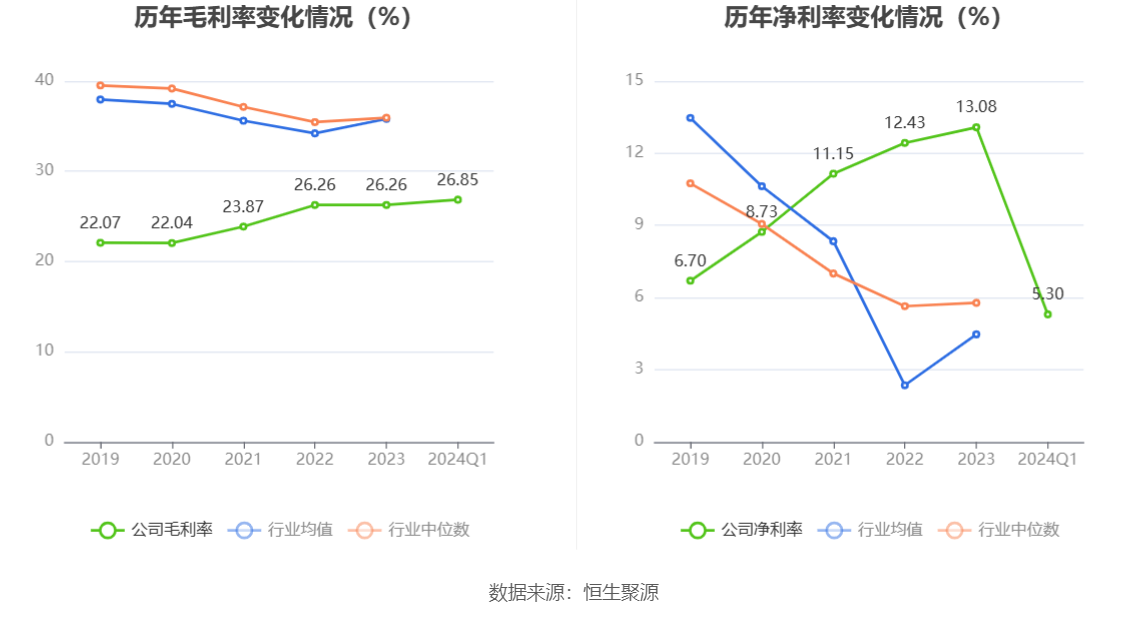 2024年第一季度,公司毛利率为26.85%,同比上升2.81个百分点;净利率为5.30%,较上年同期下降1.35个百分点。