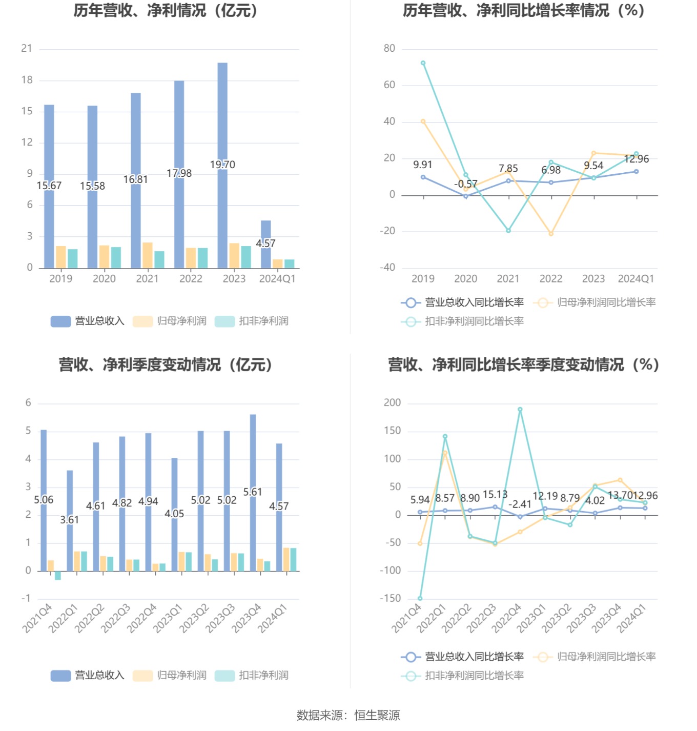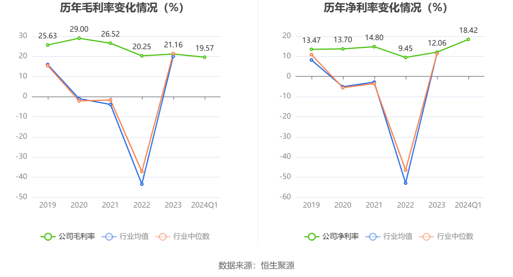 2024年第一季度,公司毛利率为19.57%,同比上升4.36个百分点;净利率为18.42%,较上年同期上升2.28个百分点。