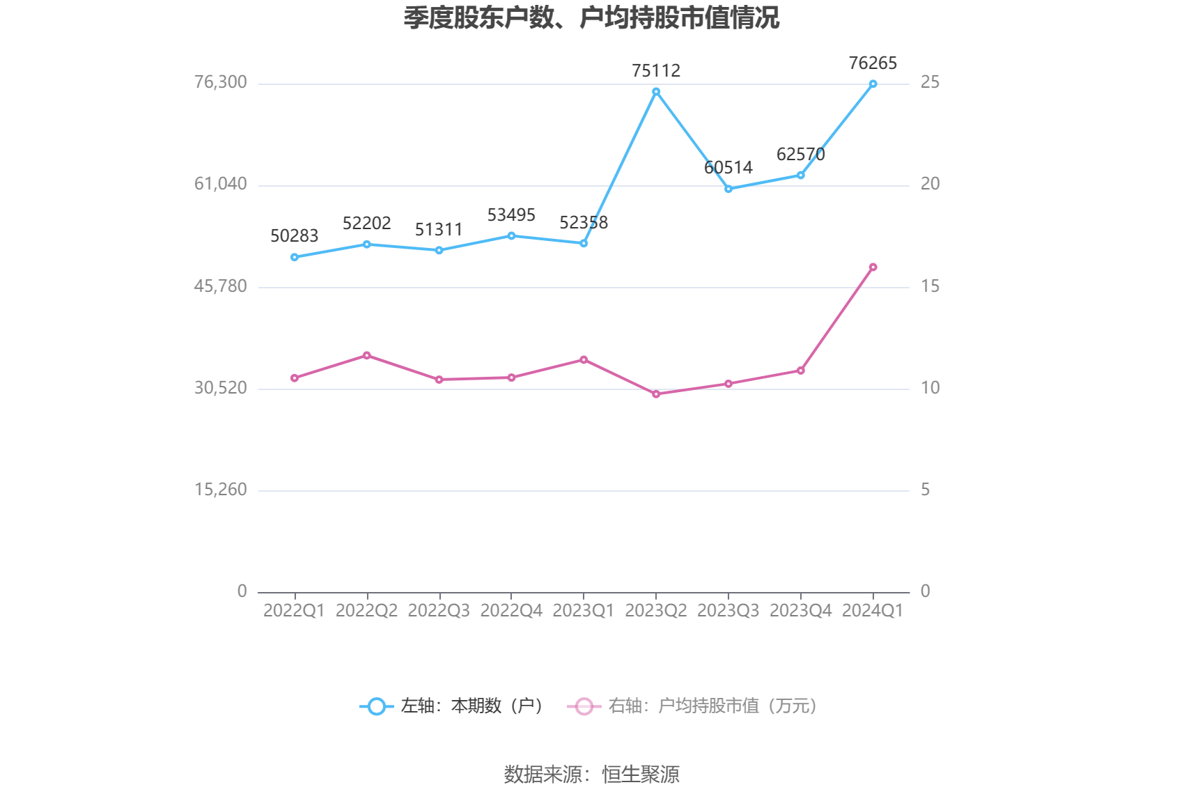 筹码集中度方面,截至2024年一季度末,公司股东总户数为7.63万户,较上年末增长了1.37万户,增幅21.89%;户均持股市值由上年末的10.91万元上升至15.99万元,增幅为46.56%。
