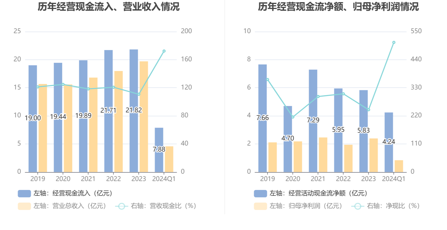 2024年第一季度,公司营业收入现金比为172.31%,净现比为507.63%。