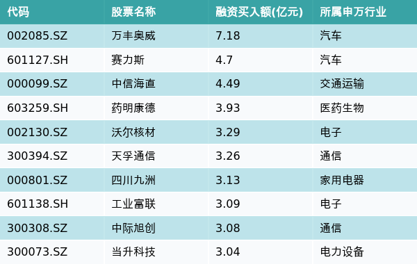 4月25日,两市共有3342只个股有融资资金买入,其中万丰奥威、赛力斯、中信海直排名前三,买入金额分别7.18亿元、4.7亿元、4.49亿元。融资买入额前10个股详情见下表: