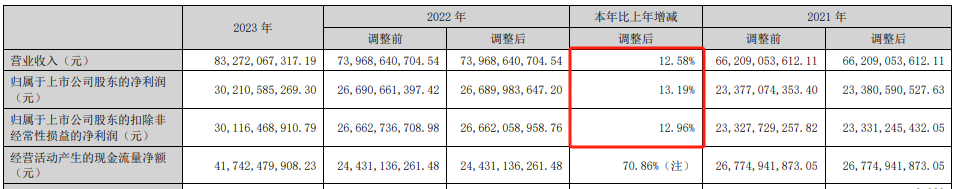 4月29日,五粮液发布2023年年报显示,公司营业收入832.72亿元,同比增长12.58%;归母净利润302.11亿元,同比增长13.19%。