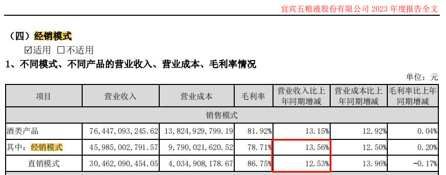 2023年,五粮液经销模式收入459.85亿元、直销模式收入304.62亿元,分别同比增长13.56%、12.53%。