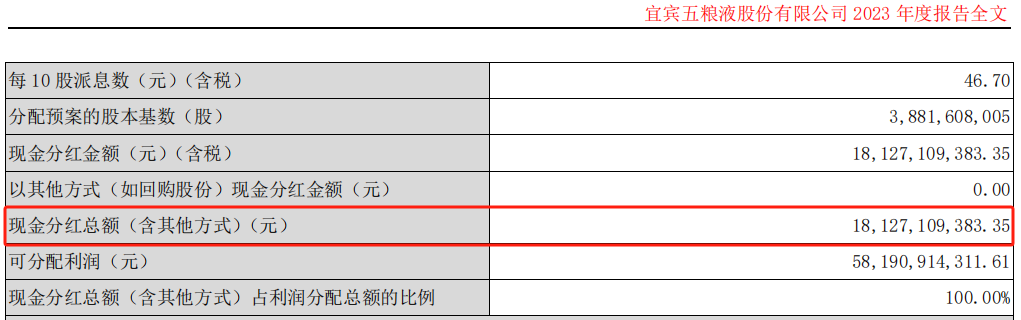 五粮液制定2023年利润分配方案为,拟向全体股东每10股派发现金红利46.70元(含税),现金分红比率60%,现金分红总额181.27亿元,分红比率和分红规模均创上市以来新高。