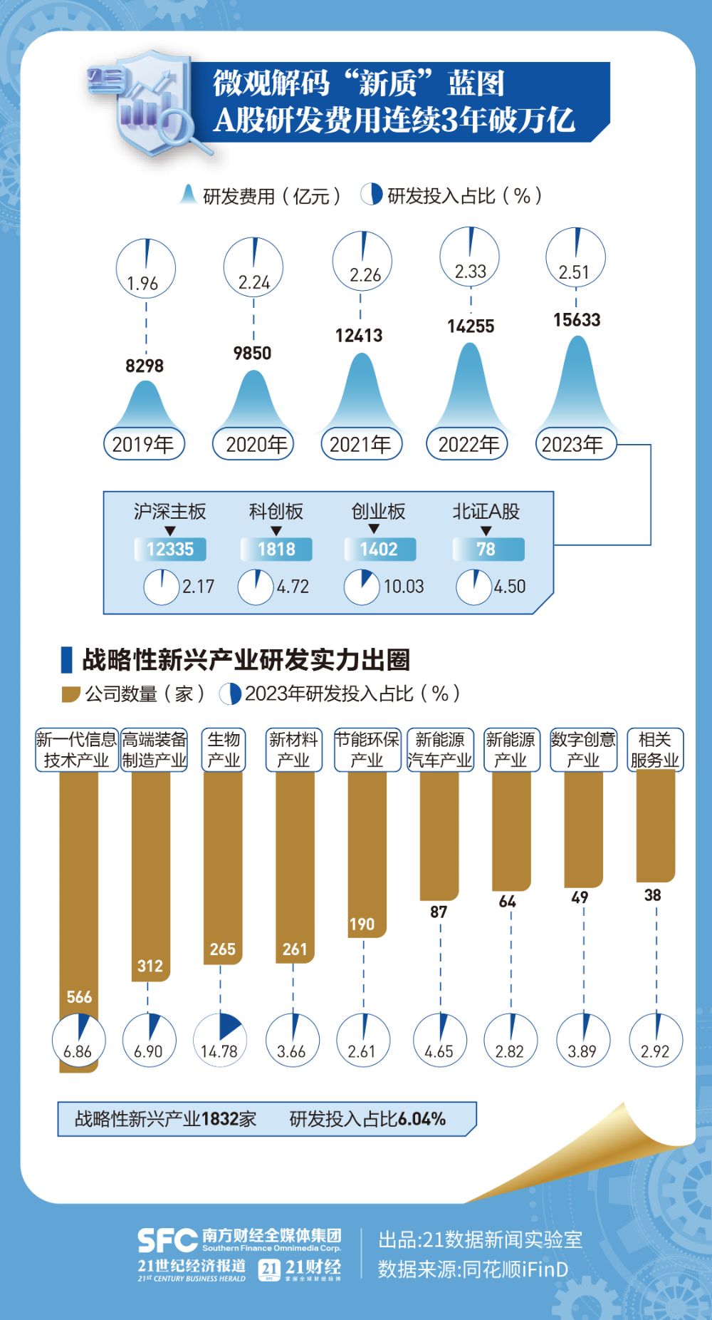新质生产力驱动产业发展,A股研发费用连续3年破万亿,2023年为1.56万亿元,较上年提升9.67%。其中,战略性新兴产业上市公司数量超1800家,细分领域中的生物产业研发投入占比高达14.8%。