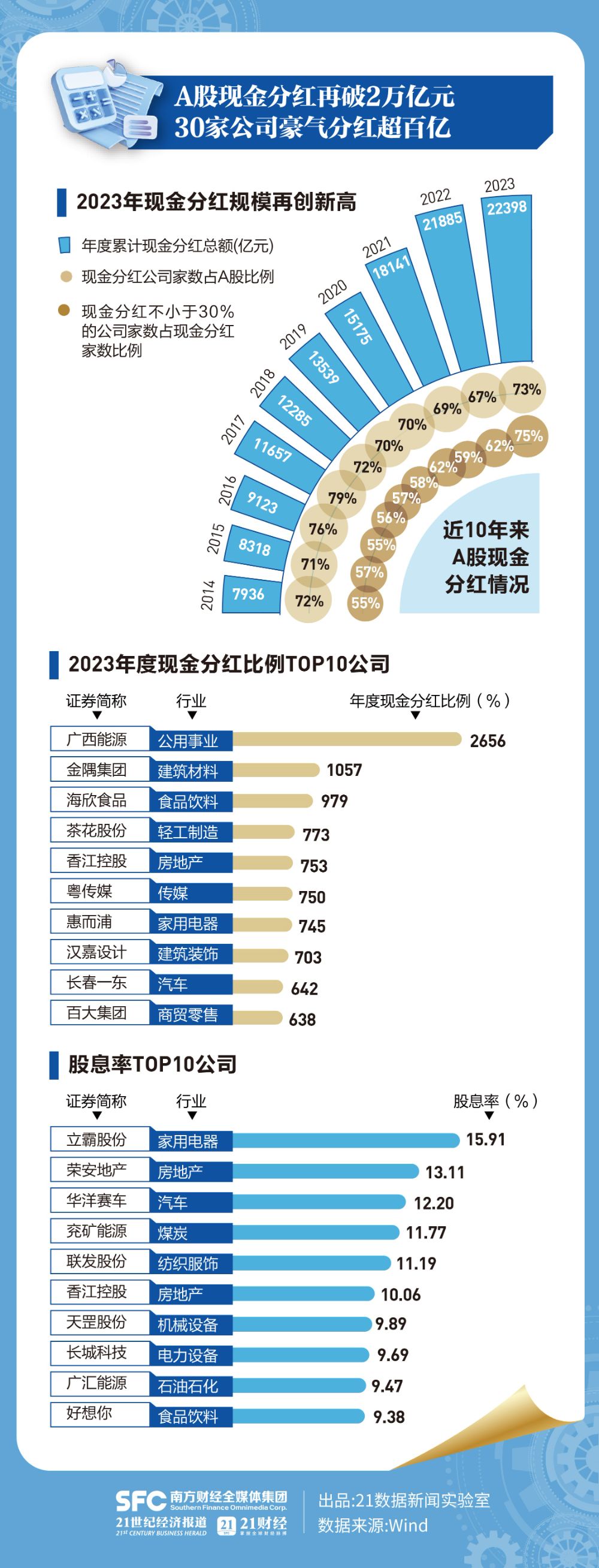 A股近10年现金分红规模稳步提升,近两年累计分红金额均突破2万亿。