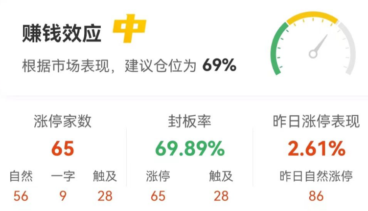 涨停个股数量方面,截至收盘,今日共计65股涨停,另有28个股盘中一度触及涨停,封板率69.89%。