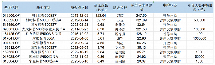 Wind数据显示,截至5月9日,市面上共有11只跟踪标普500指数的相关产品。其中成立最早的是大成标普500等权重人民币,成立于2011年3月23日,截至今年一季度末规模为6.38亿元。